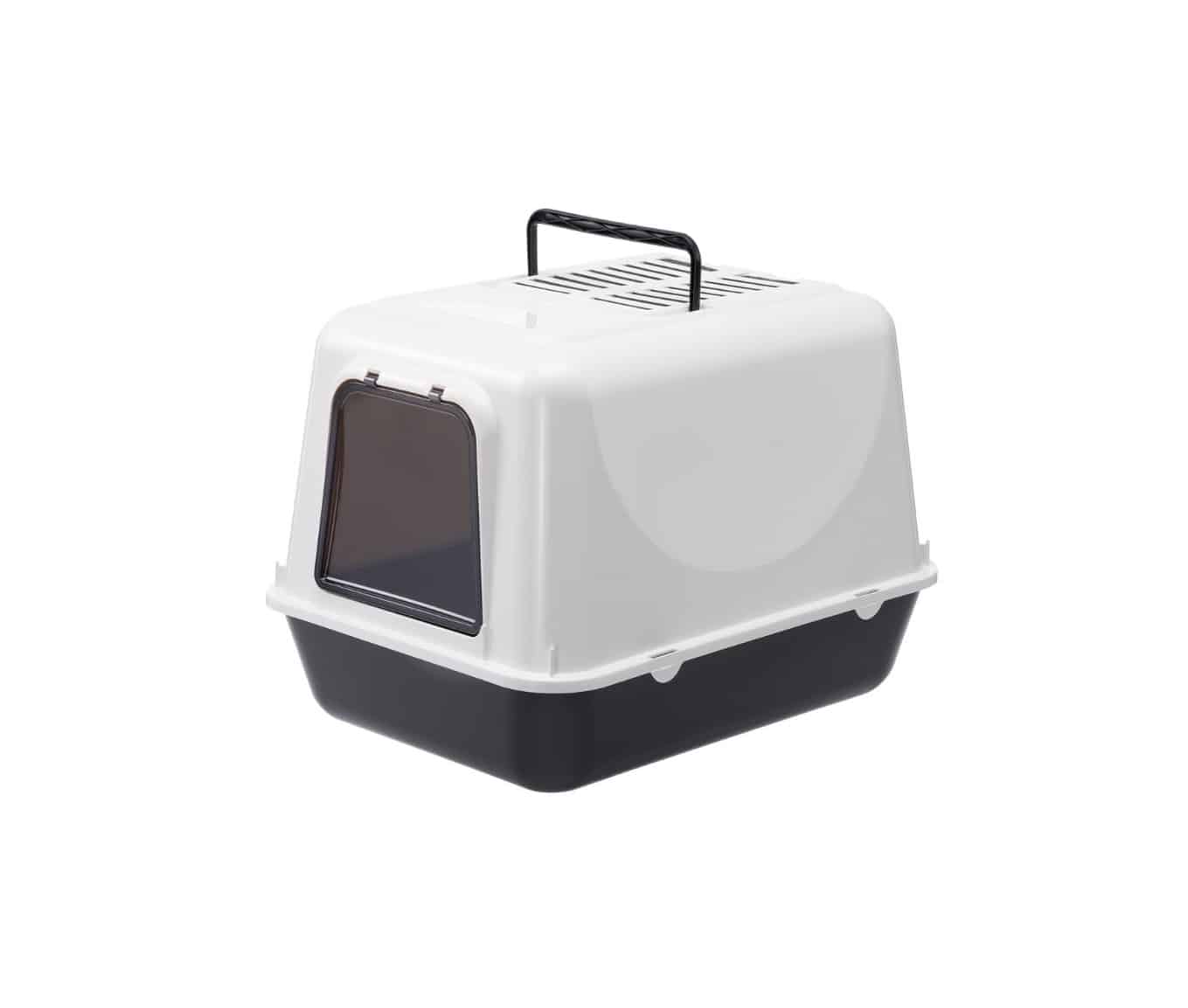 כלי צרכים קליר קט, שירותי פלסטיק בסגנון מודרני בצבע שחור עם מסגרת לבנה, המיועד לצרכים של חתולים בוגרים.